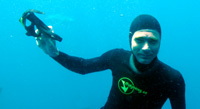 Cedric does 18 meters on his second dive thanks to his calmness and ability for long breath holds. Unfortunately that’s the bottom. I take the opportunity to suggest him forgetting about that so called "world record" and compare with common freedivers. Who knows how that other guy descended to 11 meters, he might have only used one arm for all we now, so show him some respect. In the olympics disabled people compete in a variety of categories.