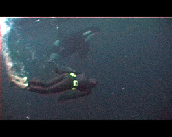 We encounter the orcas when there is only 30 minutes of sunlight left. They spyhop and tailsplash and seem to be a happy lot, not moving so fast, there must be herring down there. Stig and I get in. And there they are: a flock of 12-15 orcas passing 5-10 meters in front of us, one turning and looking at Stig. The object of the day is getting Stig and an Orca in the same shot. Visibility goes down with the diminishing light so I am not sure I got the moneyshot. Suddenly an Orca passes under me to the side and rushes up behind Stig and it looks as if it touches his fin blades with its nose did I get that on camera dont know it was over in a second. As usual there is total chaos in the windy wavy water, we are as stressed as the little herrings. Look, there! Herring floating paralyzed in the water 5 meter down. We follow the streak of silvery scales raining down towards the deep bottom of the fjord. Soon we see the ball of herring gathered by the orcas.