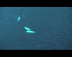 Amazing. We move in right after the orcas have slapped the ball of herring with their tails and we pick paralyzed herring out of mid water. The shocked silvery herring wrestles in our hands. I move in with the camera a feet from the swirling ball of herring, all of a sudden a black and white head is coming towards me, hesitates for half a second and he moves on. Was he going to slap the herring and found me in the way?